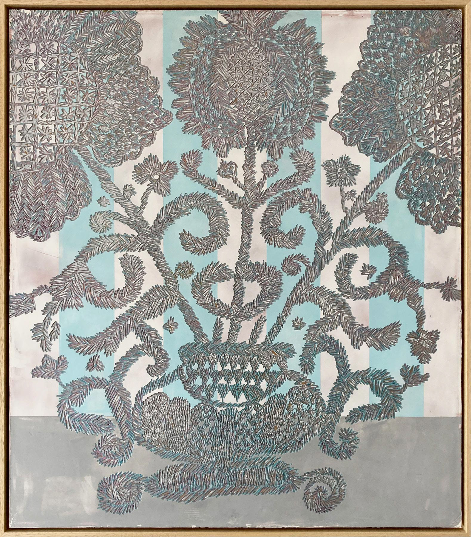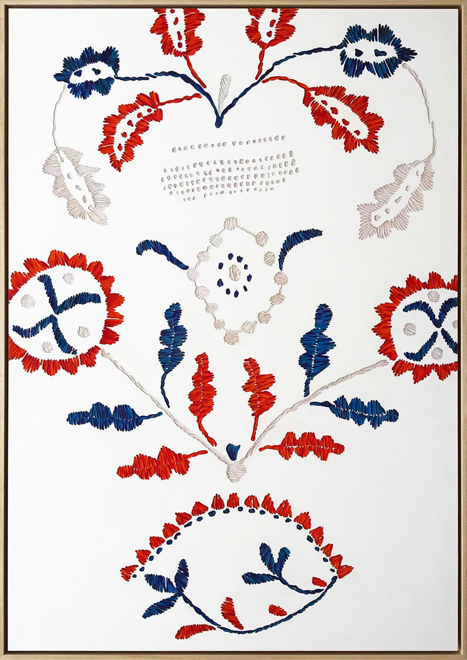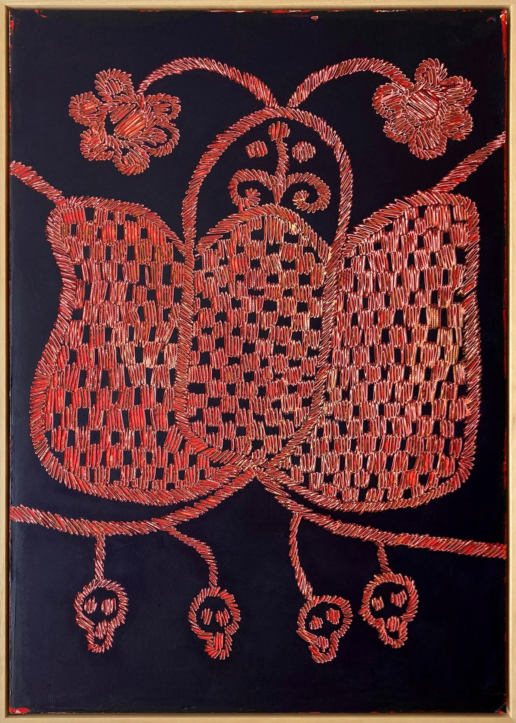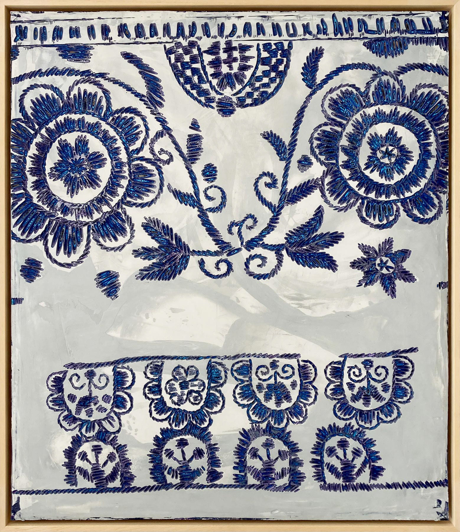 The cycle Blast from the Past reflects on the genesis of Slovak folk ornamentation and explores the possibilities of applying its visual language within contemporary visual culture. Folk ornament, as a significant impulse in my creative practice, offers a wealth of inspiring points of departure thanks to its multilayered meanings. For instance, embroidery on traditional garments, beyond its aesthetic function, also communicated social status, origin, and family background. In the case of ritual objects, folk ornamentation likewise carried a magical function. Equally inspiring is the natural, spontaneous aesthetic of folk artistic expression itself, which continues to fascinate me.